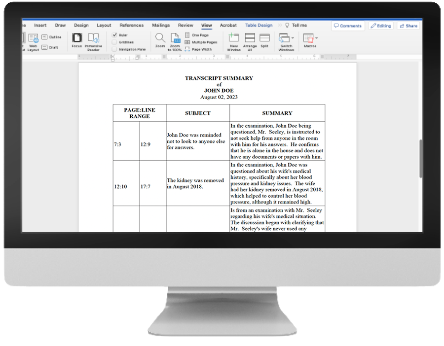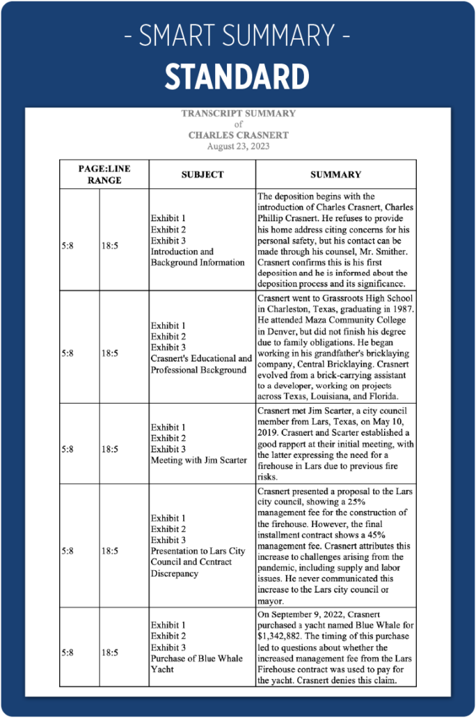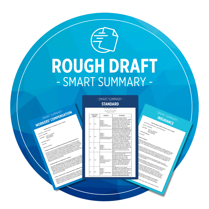 Smart Summary is an AI-generated abstract of either the rough draft or the official proceeding transcript. The draft summary is provided in an editable and convenient Microsoft Word™ format — so that you can edit text, highlight key testimony and make it your own!