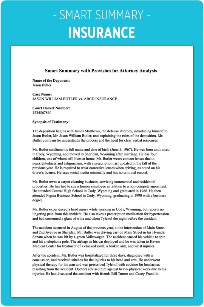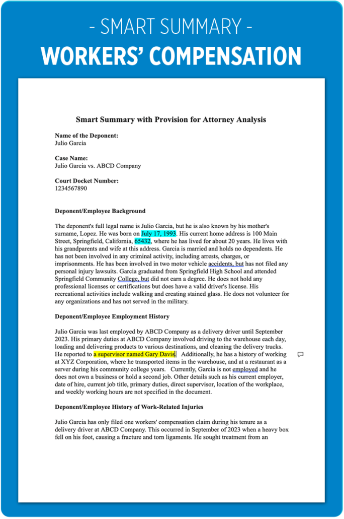 Whether utilizing the Standard, Workers’ Compensation or Insurance Smart Summary — details are clearly presented and easy to quickly find within the summarized text!