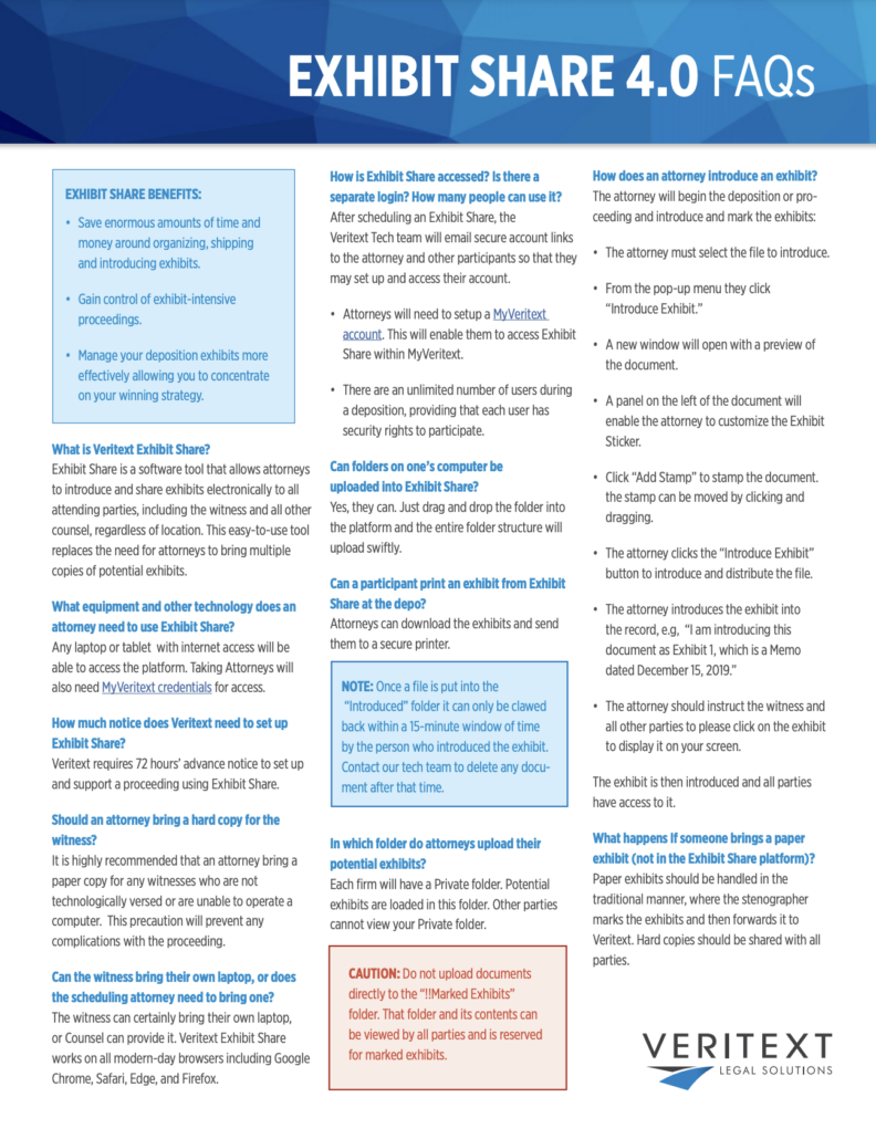 I am a litigator with 40 years of experience who thought I knew everything there was to know about deposition taking. But then I discovered Veritext’s Exhibit Share web product, which allows you to upload deposition exhibits to a web portal and avoid having to reproduce (and then carry to the deposition) massive paper copies for the 30 some defendants and cross-defendants in any single deposition.