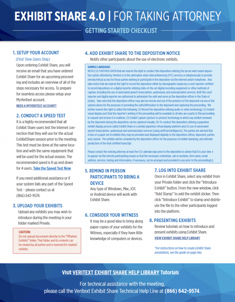 NOTICE IS FURTHER GIVEN that we reserve the right to conduct this deposition utilizing the secure web-based deposition option afforded by Veritext or in the alternative video teleconferencing (VTC) services or telephonically to provide remote/virtual access for those parties wishing to participate in the deposition via the internet and/or telephone. Also take notice that we reserve the right to record the deposition either by stenographic means by a court reporter certified to record depositions or a digital reporter utilizing state-of-the-art digital recording equipment or other methods of capture, including the use of automated speech transcription, audiovisual, and summarization services. Both the court reporter and digital reporter are authorized to administer the oath and serve as the deposition officer in the State of [state]. Take note that the deposition officer may also be remote and out of the presence of the deponent via one of the options above for the purposes of providing the oath/affirmation to the deponent and capturing the proceeding. We further reserve the right to utilize the following: (1) Record the deposition utilizing audio or video technology; (2) Instant visual display such that the reporter’s writing of the proceeding will be available to all who are a party to this proceeding to request and receive it in realtime; (3) Exhibit Capture (picture-in-picture) technology in which any exhibit reviewed by the deponent during the deposition can be captured visually; (4) To conduct this deposition utilizing a paperless exhibit display process called Exhibit Share or a similar paperless virtual display platform and (5) use of automated speech transcription, audiovisual and summarization services [using artificial intelligence]. The parties are advised that in lieu of a paper set of exhibits they may be provided and displayed digitally to the deposition officer, deponent, parties and counsel. The exhibits will be compiled by the deposition officer for the purposes of exhibit stamping, and ultimate production of the final certified transcript.